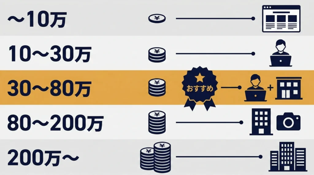 中小企業で最も多い予算帯は30万〜80万円です。この価格帯であれば、フリーランスまたは小規模制作会社への依頼で、品質の高いコーポレートサイトが制作可能です。