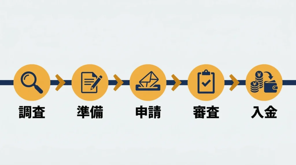 補助金の申請は、大まかに以下の流れで進みます。ここでは小規模事業者持続化補助金を例に解説します。